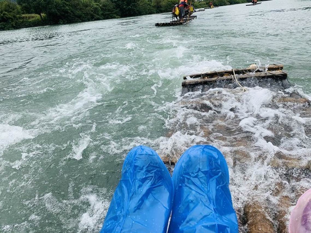 竹筏漂流还是蛮有意思的。在漂流的过程中会溅起很多水花,一一定要买雨鞋套。真的是超简单的鞋套,10块钱一双。
