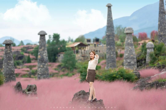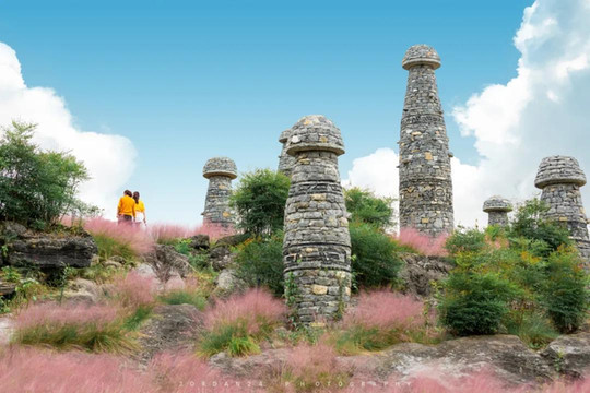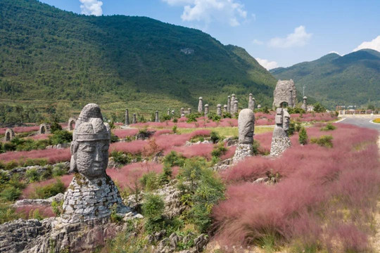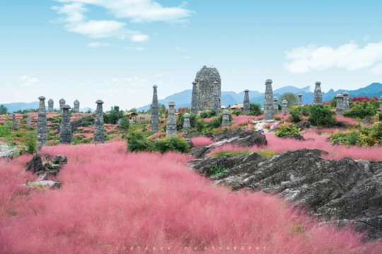 穿过中国最大的叠石艺术大门,景区内寒武纪海生化石随处可见。秋冬季节时分,漫山遍野的粉黛草激起少女心。