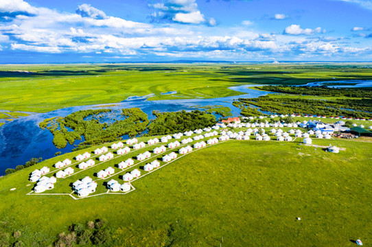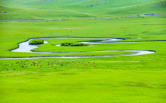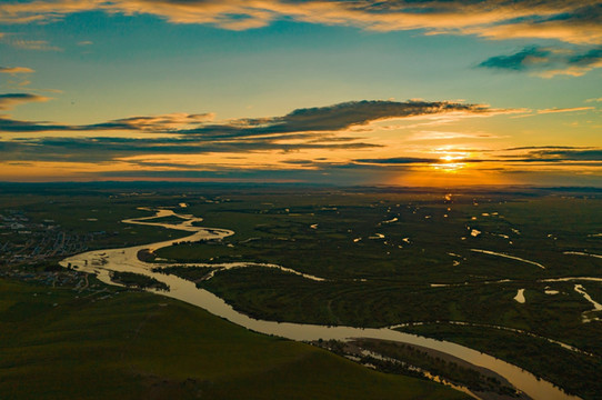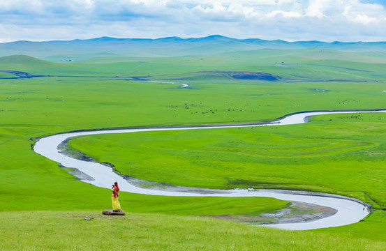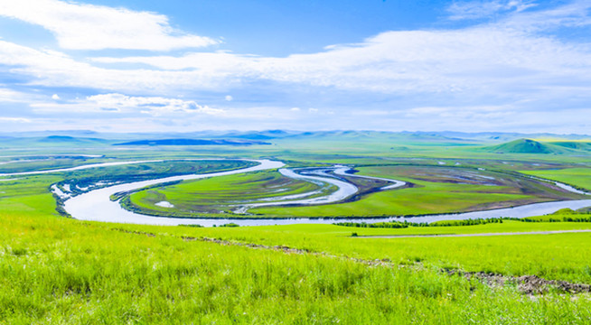 在牧云山顶鸟瞰草原,可看到一条弯弯曲曲的小河——莫日格勒河。老舍曾经赞叹莫日格勒河,说它像迂回的、明如玻璃的一条带子,并认为它是“天下第一 曲水 ”。蓝天白云、弯曲河流、碧绿草原、游动吃着草的牛羊群、点点星星的白色 蒙古 包,组成了一幅生动无限的油画。
