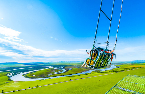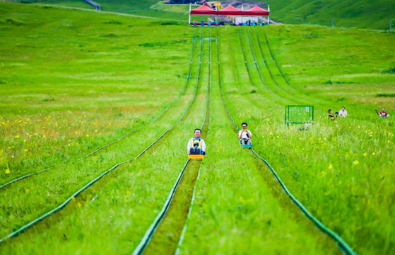 牧草丰茂,碧绿的草原一望无际,伸手可及的白云,成群的牛羊散游草地,温暖的风拂过我的脸庞,仿佛与这里融为一体了。这里除了风景迷人,还可以体验特色彩虹滑道、滑翔机和热气球。