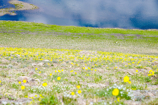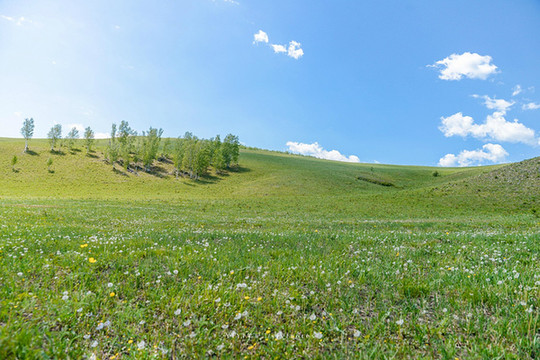 ▼五月底的草原上开满了黄色小花与白色蒲公英。