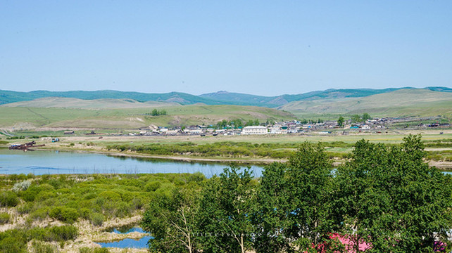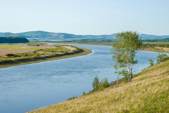 蓝色的 额尔古纳 河静静的流淌着,河对面就是 俄罗斯 小村庄。