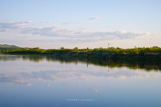 额尔古纳 河平静的就像是一面镜子,倒影清晰可见,有时候还能看到河对面玩耍的 俄罗斯 人,嗨,互相打个招呼。