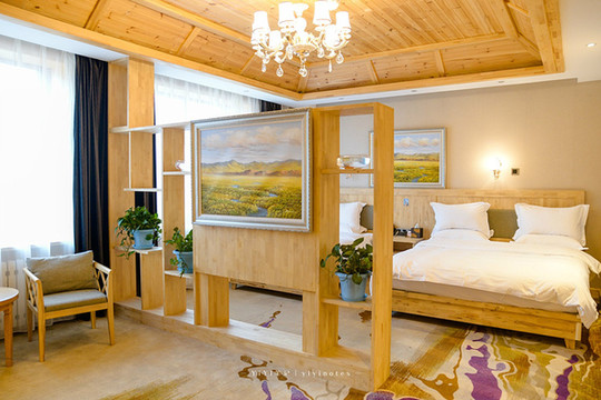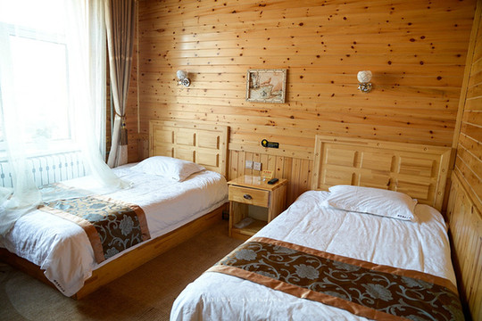 新开的一家酒店,外观是俄式建筑。房间比较大,房间内全部为白桦木原木所造,并且未刷过油漆,走进房间就能闻到原木的香味。