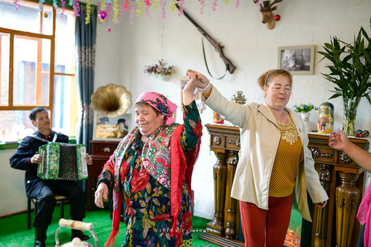 这家人是当地的 俄罗斯 族,也就是 俄罗斯 移民的后裔,五官也有着很明显的 俄罗斯 人特征。一家人载歌载舞的为我们表演节目,非常热闹。