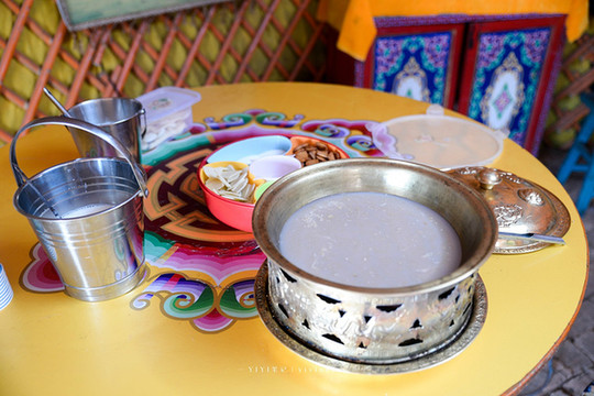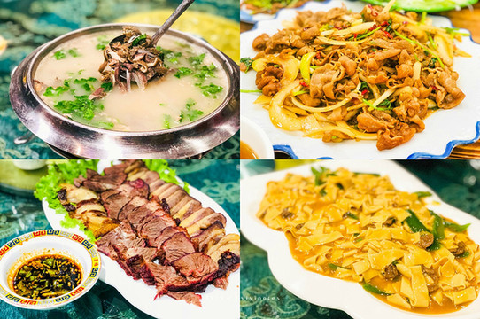 地道 蒙古 菜,以牛羊肉为主,烤羊腿肉、羊杂汤、小炒羊肉,羊肉都很正宗,还要再配一壶奶茶。