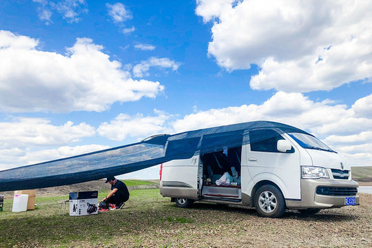 穿越草原的一天,中午找了一片既有河流风又小的地方野餐。我们把车停在了河边,支起简易帐篷,再铺上野餐布。坐在帐篷底下用餐,与草原为伴的午餐太美了。