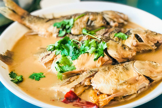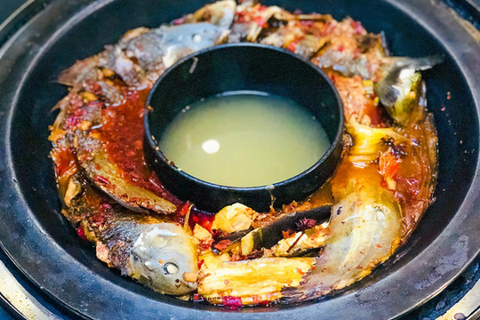铁锅炖鱼,在我们到之前磊哥就提前联系老板先炖好,锅里有三种鱼,炖出来的鱼肉特别鲜嫩,锅底还有蔬菜,就着画卷吃刚好。
