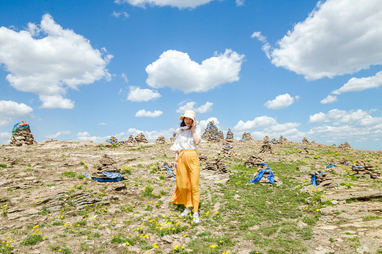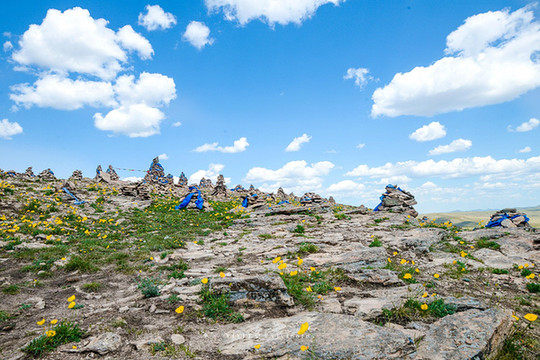 前方的石头阵,这就是《鬼吹灯之寻龙诀》电影的取景地,胡八一、王凯旋下乡的那片大草原。石头阵上还开满了小花,还有蓝天、白云映衬着,怪不得可以成为寻龙诀的重要取景地。