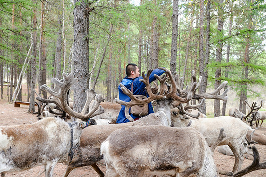 ▼在敖鲁古雅与一群驯鹿为伴,你可以零距离的与他们接触。