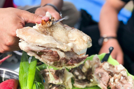 吃完了烤串儿,手把羊肉也熟了,在草原上就要大口大口的吃肉,还买带了辣酱可以蘸着吃。