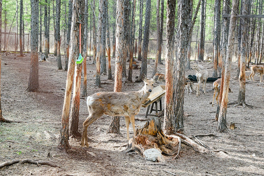 敖鲁古雅使鹿部落里除了驯鹿还能看到狍子、野兔一些小动物,不过狍子是圈养的,看到我过来就跑掉了,和驯鹿一对比,傻狍子真是瘦瘦小小的一只。
