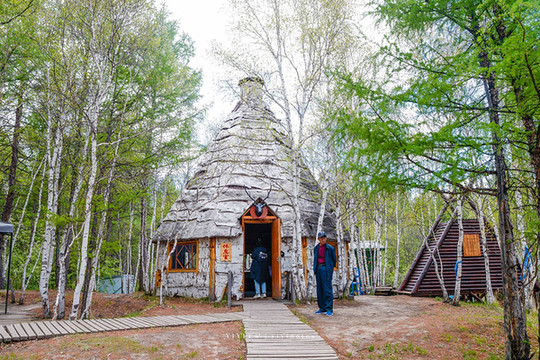 一进景区就能看到这样的白色小木屋,都是桦树皮搭的,鄂温克族信奉“萨满” 拜祭树神,敖鲁古雅是属于鄂温克族的一个小部落。敖鲁古雅使鹿部落过去一直生活在在 大兴安岭 深山里放牧驯鹿和打猎,是 中国 最后一个放下猎枪的民族,也是 中国 唯一的使鹿部落,很神奇。
