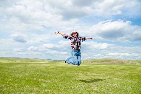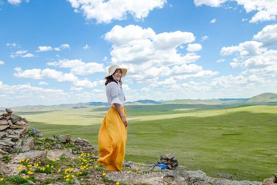 草原上仿佛触手可及的云彩,妈妈也是开心到飞起。