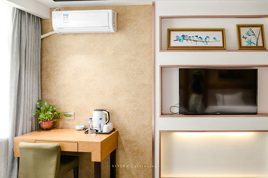 酒店离市中心,周围有商场,购物很方便。房间环境很好,面积也较大,而且很安静,还有电动窗帘。