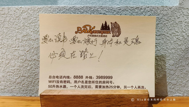 桌子上有张小卡片,里头写着一句话:“要么读书,要么旅行,身体和灵魂,必须在路上!”直戳文艺青年心窝,哈哈~