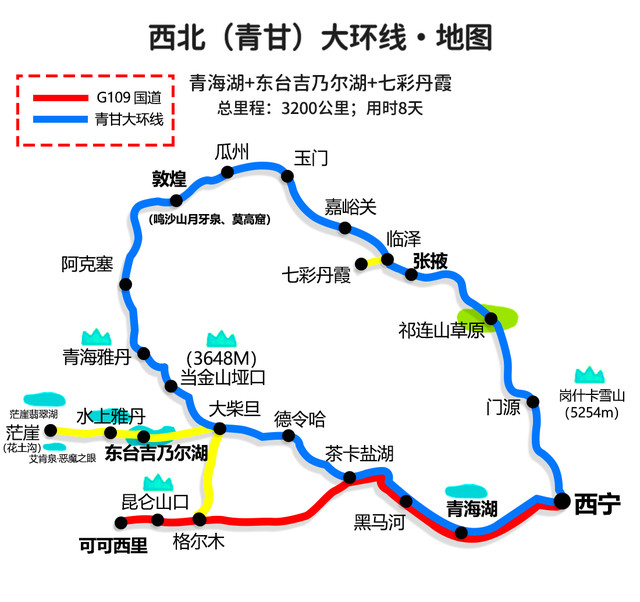 途经景点:青海湖、茶卡盐湖、可可西里、昆仑山、G315网红U型公路、东台吉乃尔湖、水上雅丹、茫崖翡翠湖、恶魔之眼艾肯泉、青海雅丹、敦煌(鸣沙山月牙泉、莫高窟)、玉门关、嘉峪关关城、张掖七彩丹霞、祁连山草原、门源油菜花。