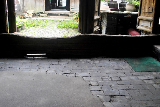 在这墙门间的地面中间有一块长条形的整体巨石条,这个在法时是起什么作用的呢?????突兀地立在屋子当中,感觉好奇怪。据说当时这间屋子有一扇屏门,难道这就是当时放置屏门的地方?