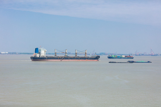 透过建筑向远处望去,这里是长江入大海的最后一湾,被称为江海交汇第一湾。江上船只往来,见证着这座城市的过往与辉煌。