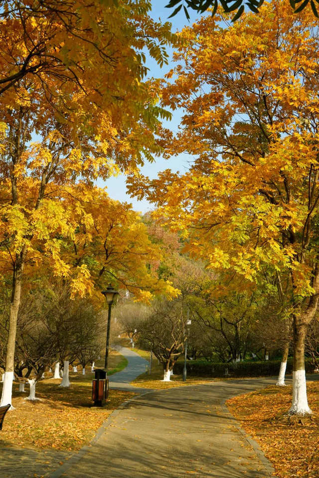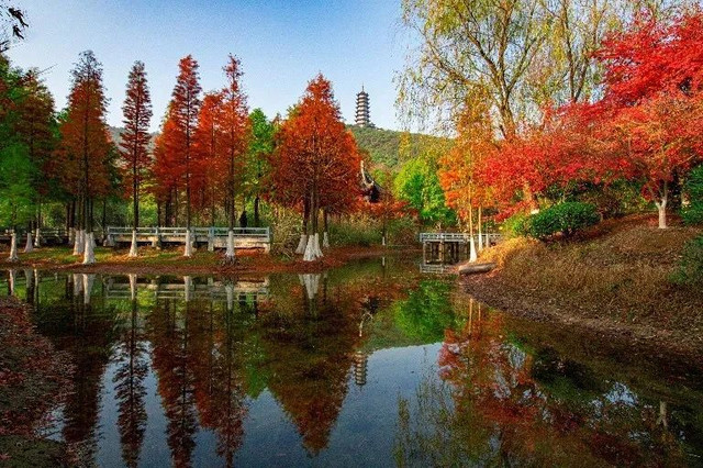 春日里的梅园,芬芳扑鼻,意境十足,如今,无患子、水杉、鸡爪槭等树木,又展现出各自的风采。各色彩叶彼此交织,让人情不自禁地放慢脚步,静静欣赏这唯美的画境。