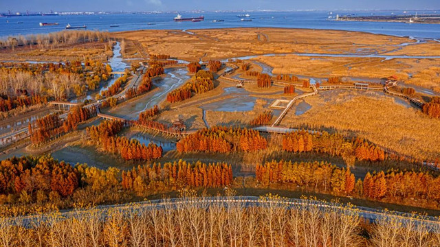 在岛上漫步,于红榉路邂逅热烈的榉树,到江心路打卡多彩的乌桕,去景观大道感受成片银杏的灿烂,各色树叶带来强烈的色彩碰撞,充满活力。如果到枫林营地和大伯墩湿地公园,晚霞般绚烂的红叶,同样美不胜收。