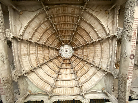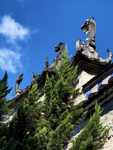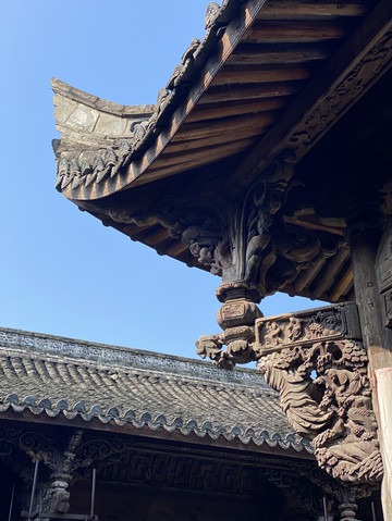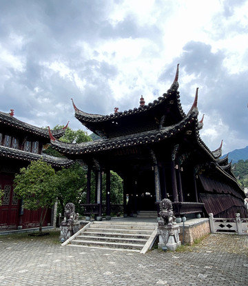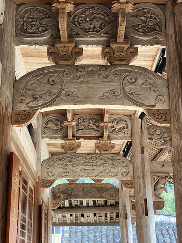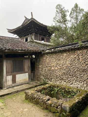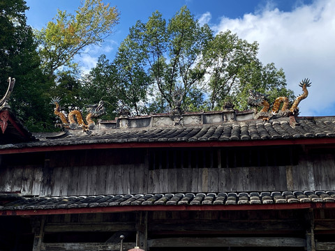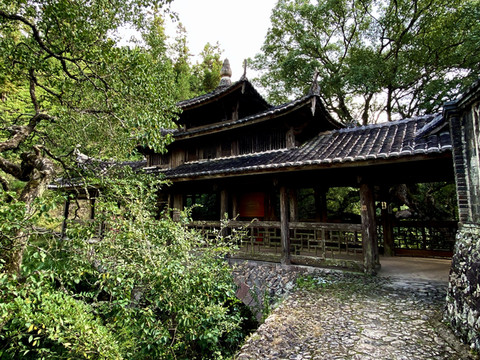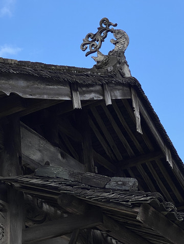 转到隔院时思寺,感觉不同于其他寺院的清净,寺内没有一尊佛像,也没有香火,但你依然能感受到那种独特的宗教和文化氛围。迎面右侧是元末建造的木构建筑大殿“大雄宝殿”,左侧的马仙宫,只剩木构建筑中的柱子和屋檐,梁拱藻井雕工精美,右侧则是建于明代的三层塔状木结构歇山顶心经钟楼。整个建筑群保留着宋、元、明、清各个时期的风格,有人说其是“宋明清三代同堂、儒释道三教同炉”的罕见古建筑群,恰如其分。
