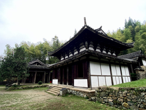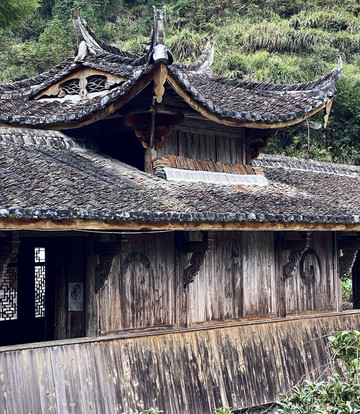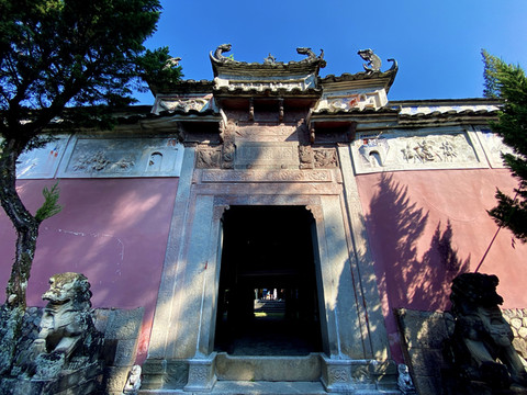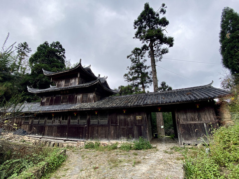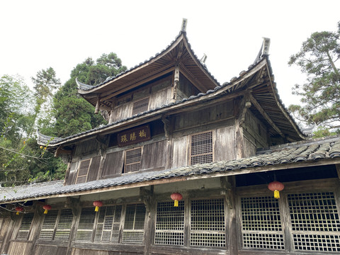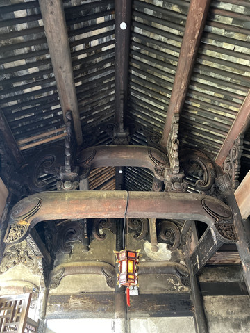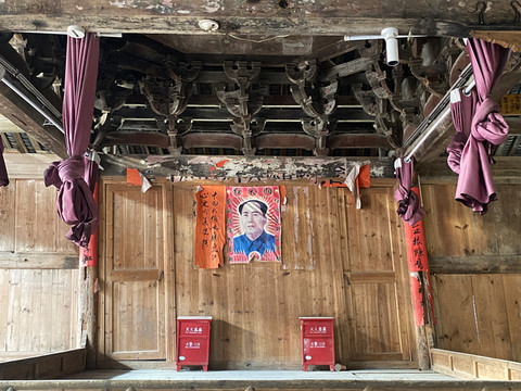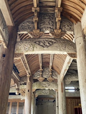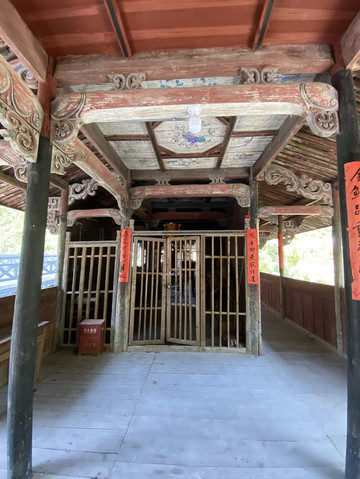 先去看了柳杉王边上的梅氏宗祠,建于明代,由祠门、厢房、叙伦堂、祭坛和报本堂五部分组成,方柱、大梁、斗拱、雕梁画栋,整个建筑沿着一条中轴线,成纵轴线四重递进式一层楼,有两重大门,一堂比一堂高,一堂比一堂宽。