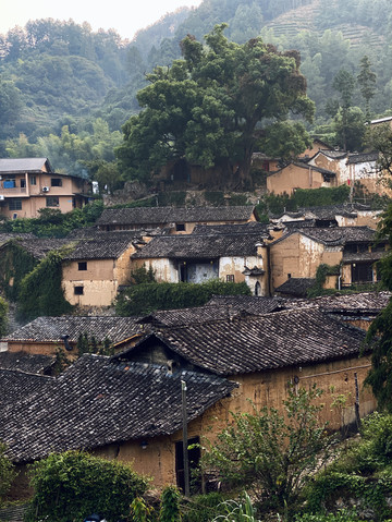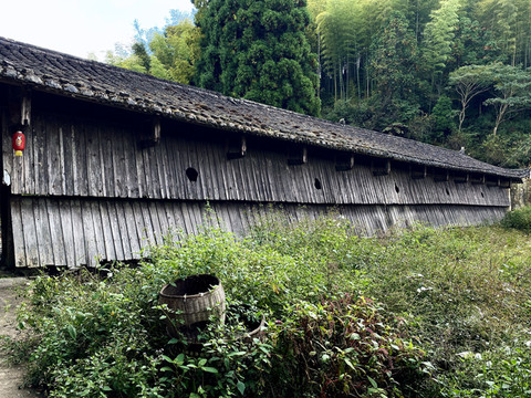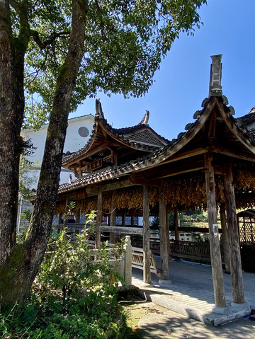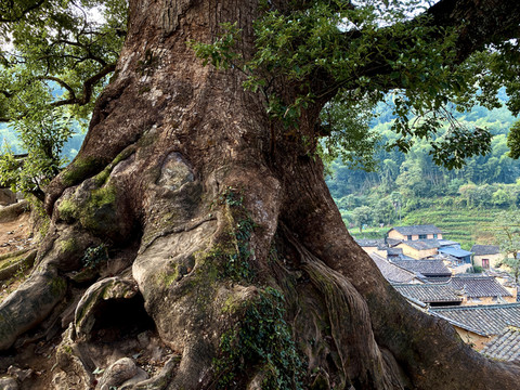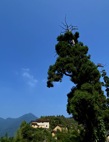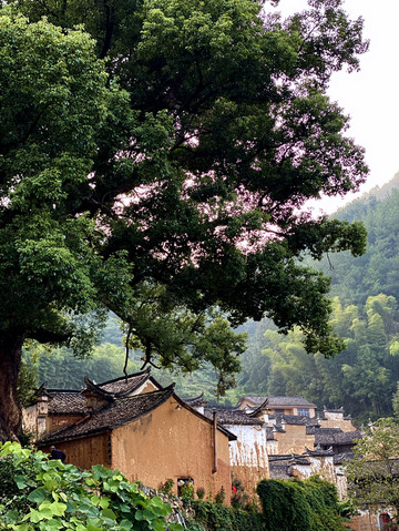 我们订的农家乐在村口外公路边,步行5分钟就能进村,比村里面的精品民宿性价比高了不少。办理入住后,一行人进村游览,村庄坐落在一座环形的山凹中,左右两翼山峦环抱,20多幢土木架构的清代民居沿着山坡一级级向上延伸,在视野中展现出一个巨大的建筑立面。村口两颗500岁的樟树在高低错落的马头墙辉映下格外古朴沧桑,见证着宋氏家族360多年的变迁。