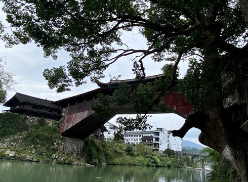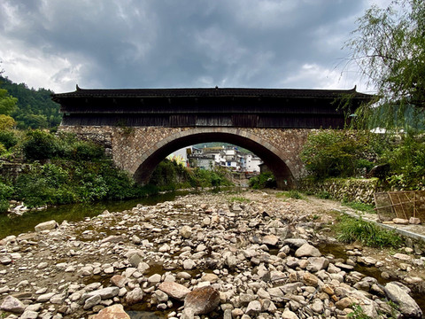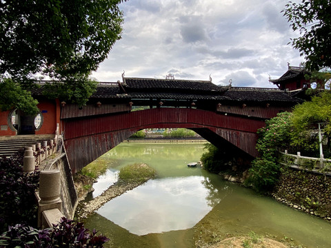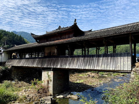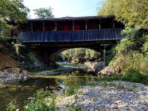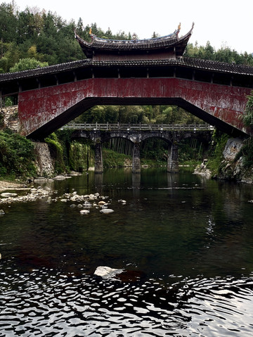 步行至北涧桥的姐妹桥----溪东桥,又称上桥,始建于明隆庆四年(1570年),桥长42米,廊屋高10米,净跨31米。桥为重檐屋顶,两个楼层12个角翼高高翘起,在远处青山的映衬下,飞红一抹,宛如是一位隔绝尘世的仙子。