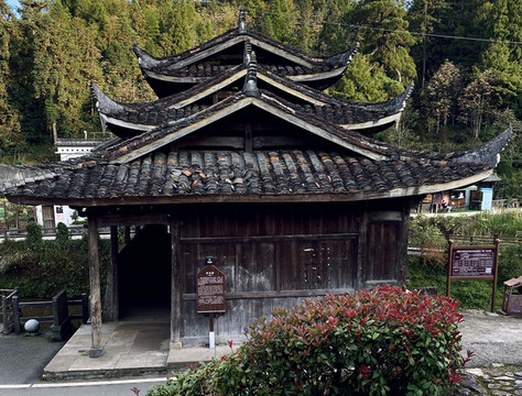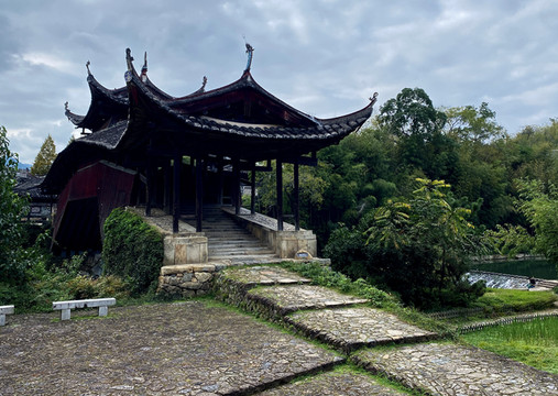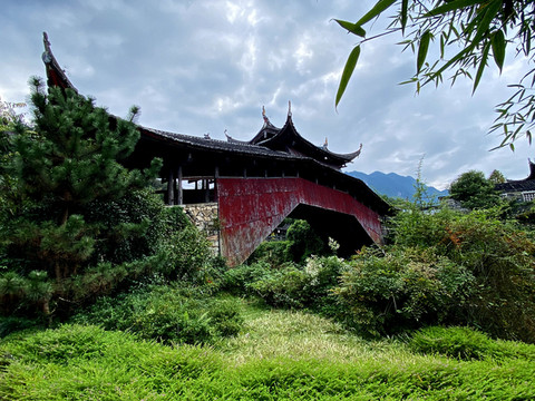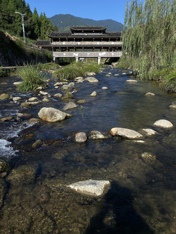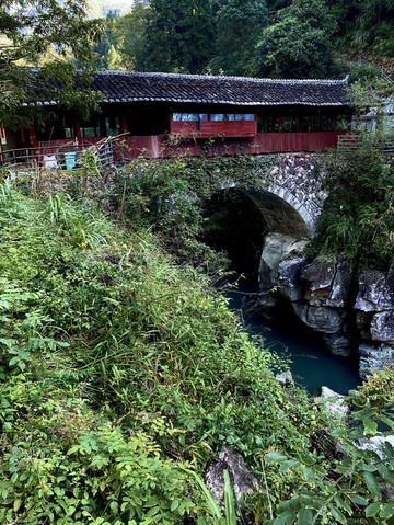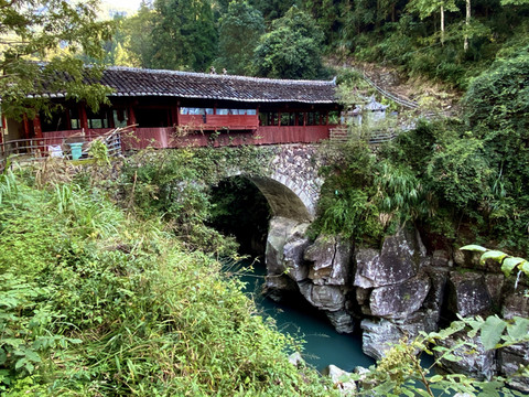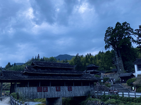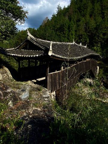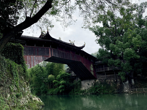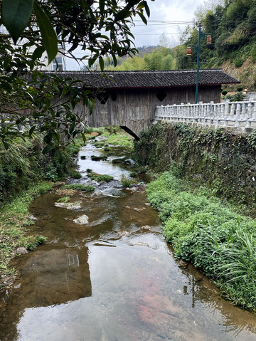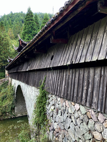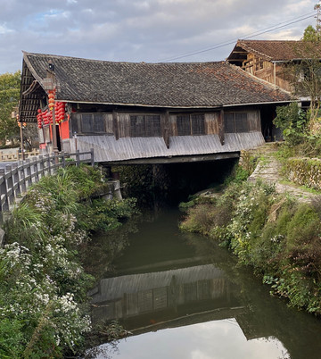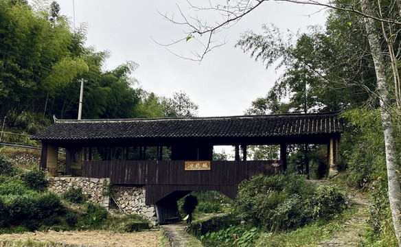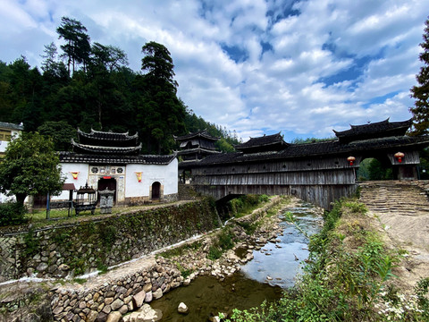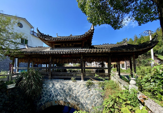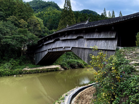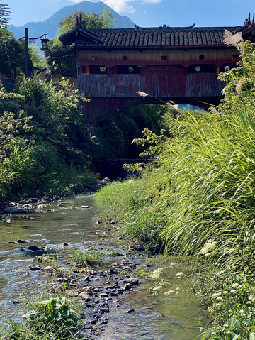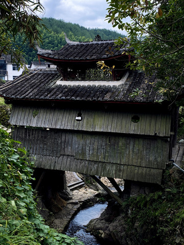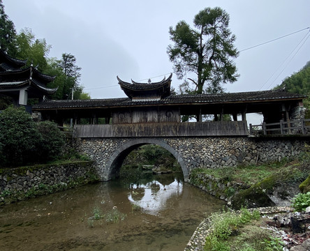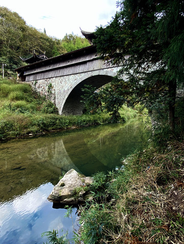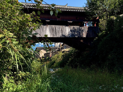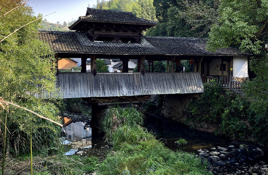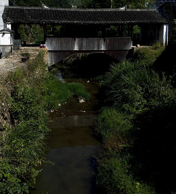 村里的威灵宝殿旁还有一座小的廊桥,名为龙溪桥,掩映在繁茂的树丛中。