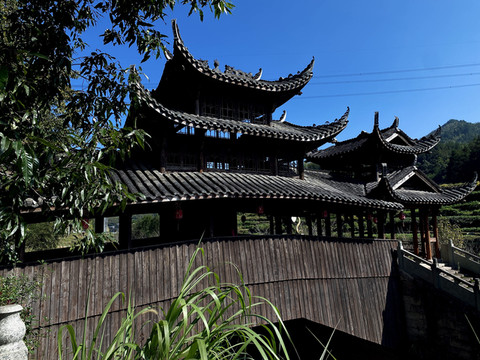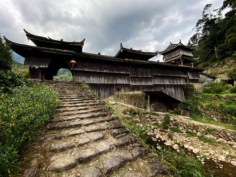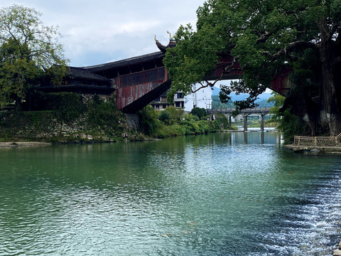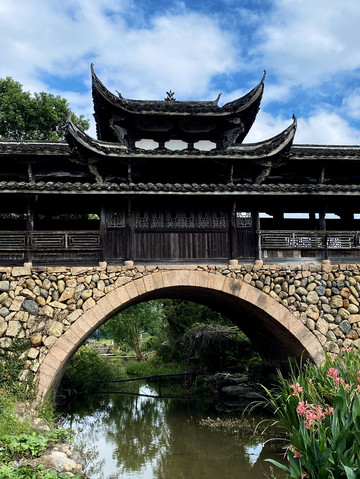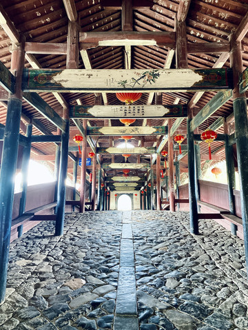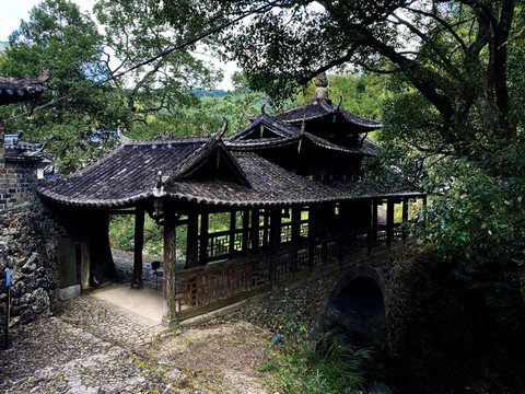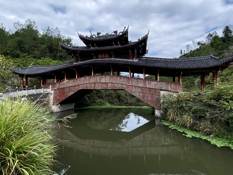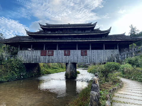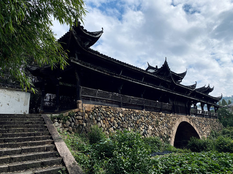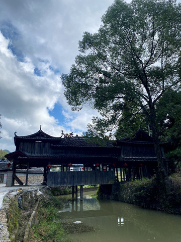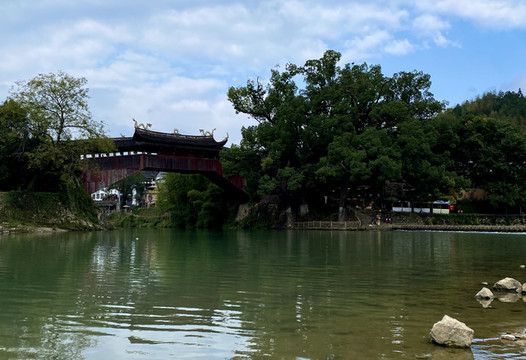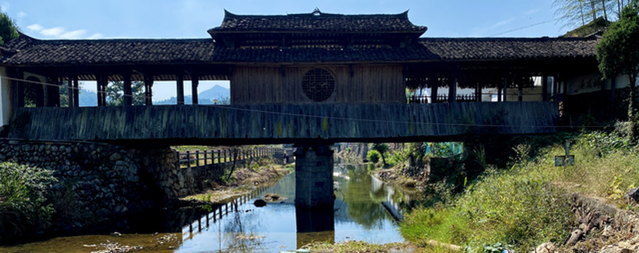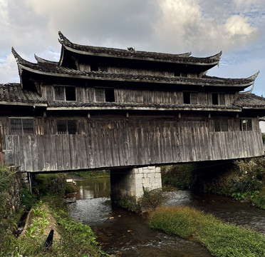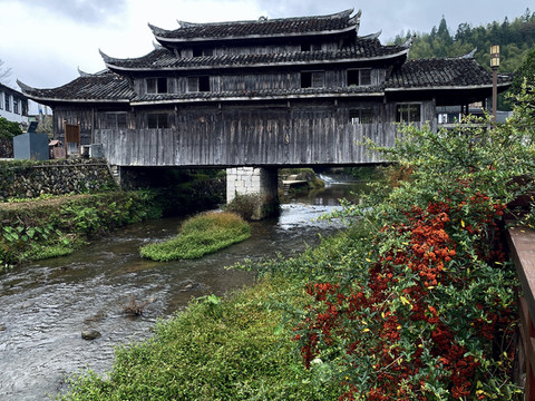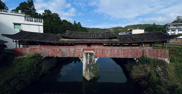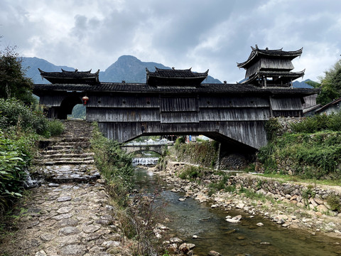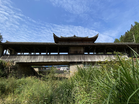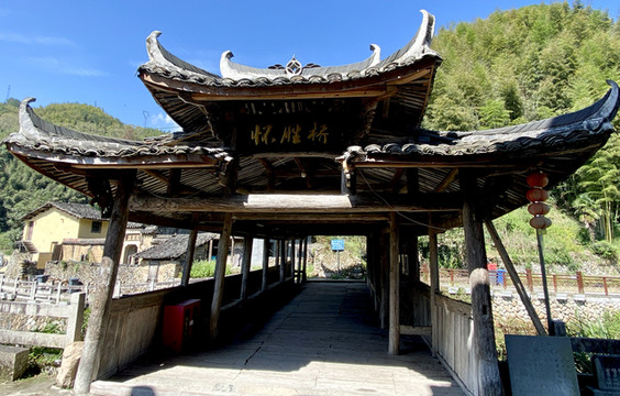 离村子最近的是环胜桥,始建于清乾隆七年(1742),光绪三年(1877)重建,为三层三檐楼阁式平梁廊桥,廊屋长30.6米,宽5.65米,高10米,净跨3.55米。主体三间为重檐歇山顶,顶层为魁星楼,二层供文昌,一层中间为私塾,左右两侧才是通行走廊,很少见的同时设有祭祀和教学场所的廊桥。