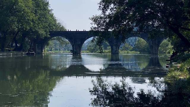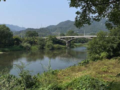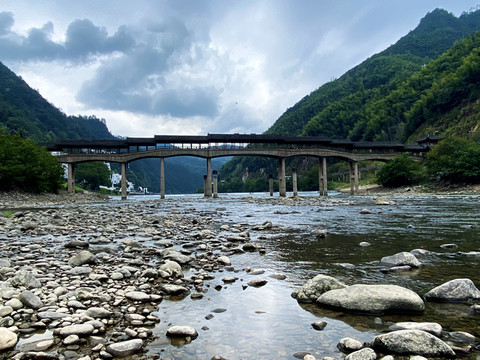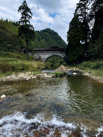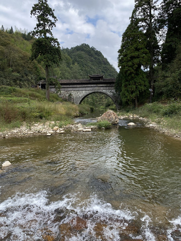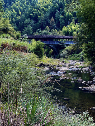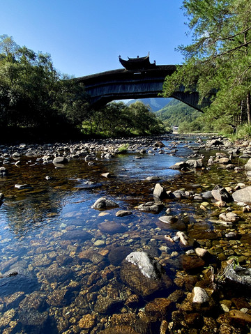 为避开人流,我们下到溪中卵石堆中观桥,从下往上看桥,气势更是雄伟,大跨度的张力在青山碧水映衬下,散发着遒劲的魅力。