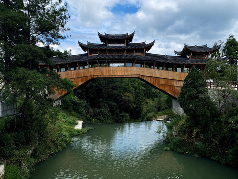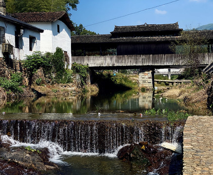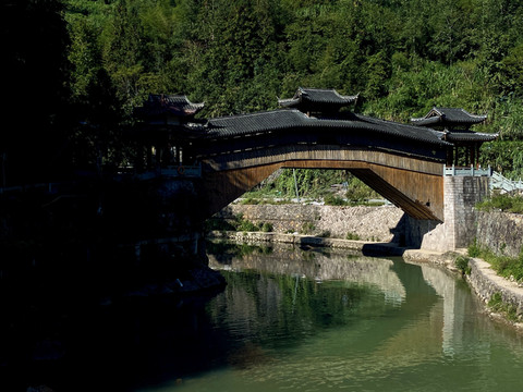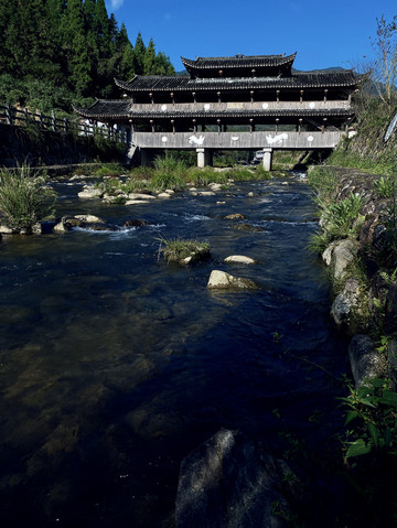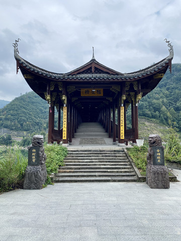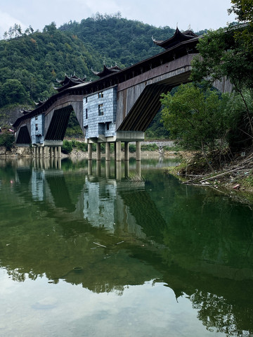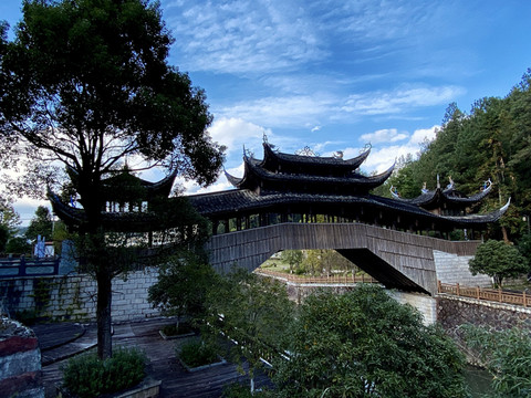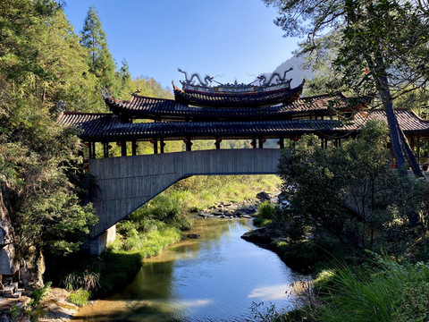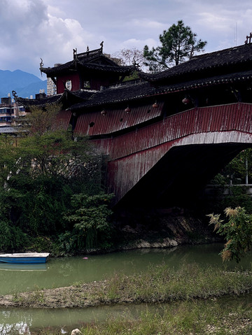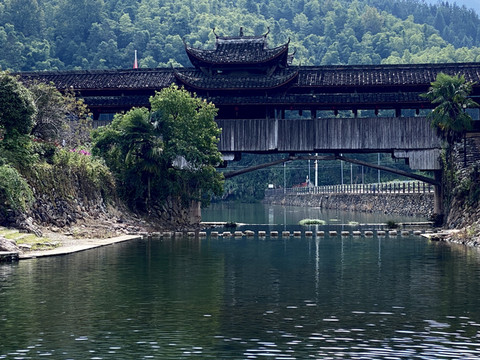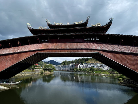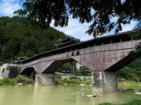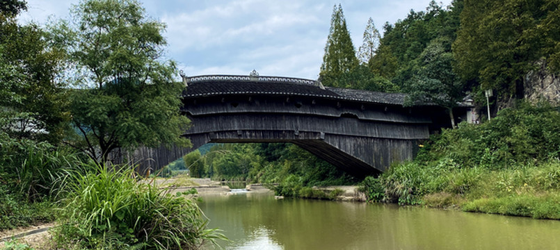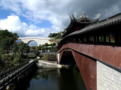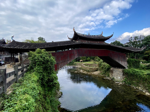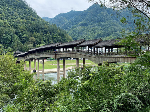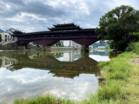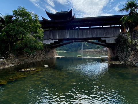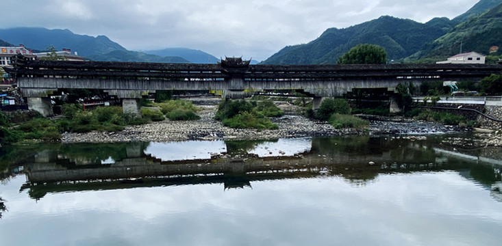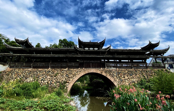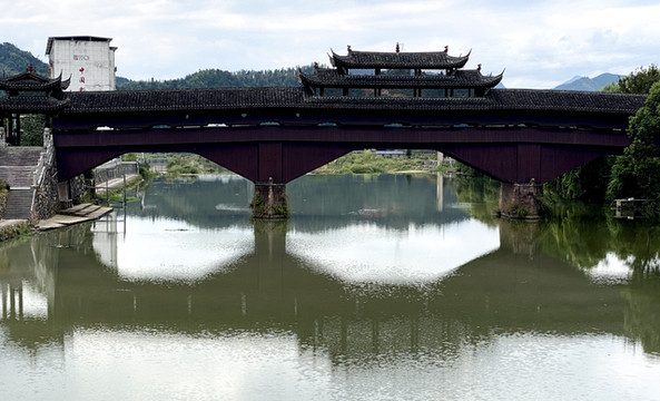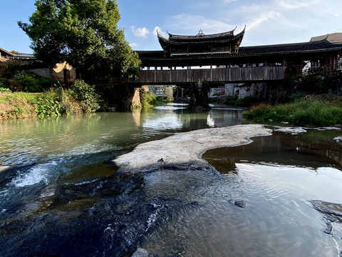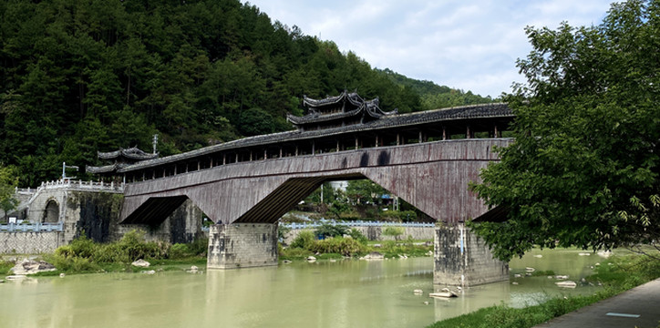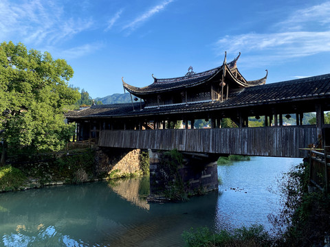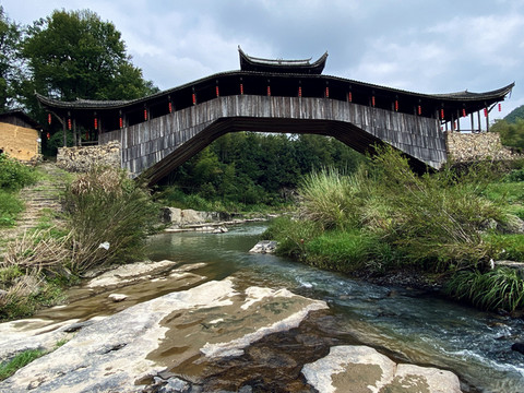 这座新建的八孔廊桥为善水桥,凌空飞跨在宽阔的溪流之上,气势宏伟。