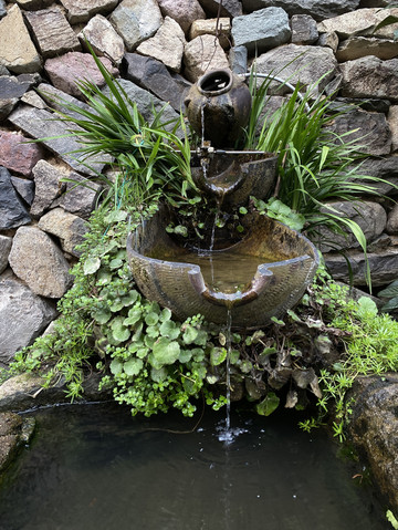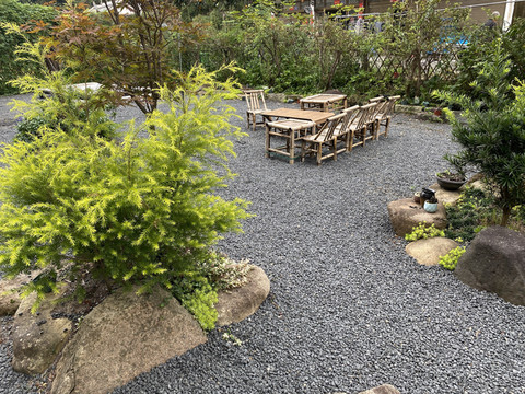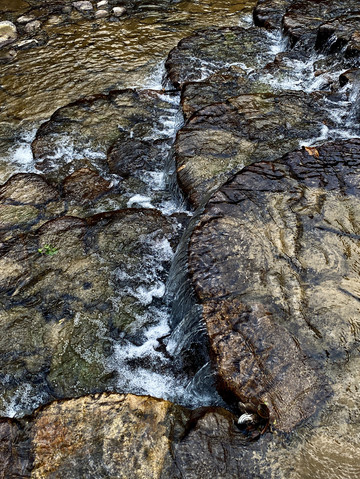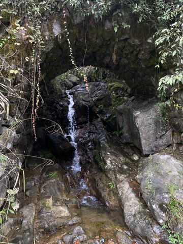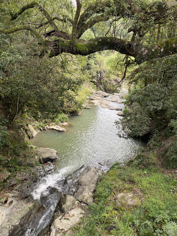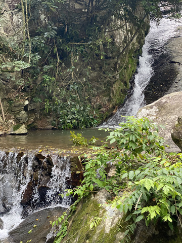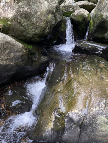 听说村后山上有瀑布,瀑布边有一家咖啡馆,于是便沿着石阶往山上爬,沿途溪流淙淙、翠竹摇曳,溪中怪石嶙峋,充满野趣,虽然瀑布不过是一道细小涓流,但瀑布旁茅草搭就的咖啡屋却给此处平添了几分韵味,可惜我们来的太晚,咖啡屋关门了,甚憾!