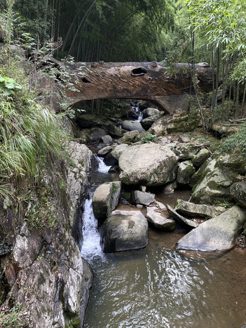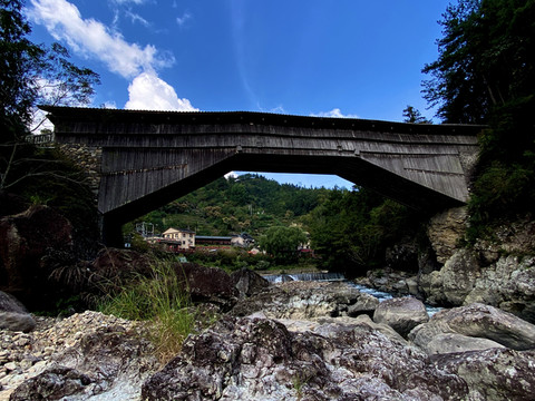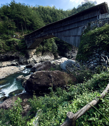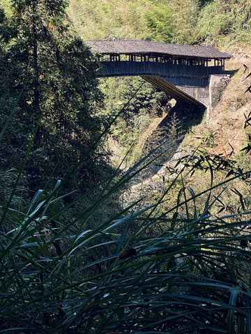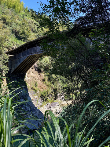 今天行程最激动人心的是章坑接龙桥。车停路边,沿着路旁很小的一块指示牌又一次走在石板古道上,约行进了700-800米,转角看到白鹤电站,建在峡谷一侧的崖上,细长的溪涧穿过山间,而前方一座高耸横跨飞云江峡谷两侧,如卧龙一般的廊桥,就是接龙桥,太震撼了,与先前的三条桥有得一比。接龙桥始建于清宣统,现存建筑为民国六年,长38米,宽4.5米,木拱架高19.6米,净跨19.6米,巧妙运用两端自然岩体为基础,桥身起势较高,颇具气势,外观造型简朴,内部结构较简,在远山翠竹碧水陪伴下,静静地卧在峡谷上。