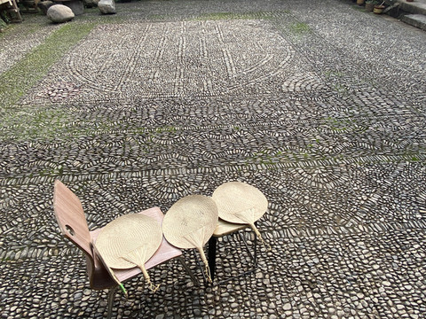 用过九松寺的素斋,应先生带我们去了百廿间。“百廿间”因潜明水库修建整体从库区松岩村变迁至壶镇团结村,是丽水市目前发现最大的清代古建筑。据《胡氏宗谱》及存匾记载,清乾隆年间建造,为胡景敦所建。建筑主体长70米,宽58.5米,总面积4095平方米,一重中门、四重边门一字形排列。从正中一扇大门往里延伸,整幢屋子分前、中、后三个大天井,层层递进。每个天井都是鹅卵石铺就,并排列有规则的花纹如福鹿、掌扇之类。在三个大天井的左右两侧各有四个中天井、四个小天井。屋内通廊纵向四条,横向三条,实际有屋90间。原来,民间的“百廿间”只是一个虚数叫法。