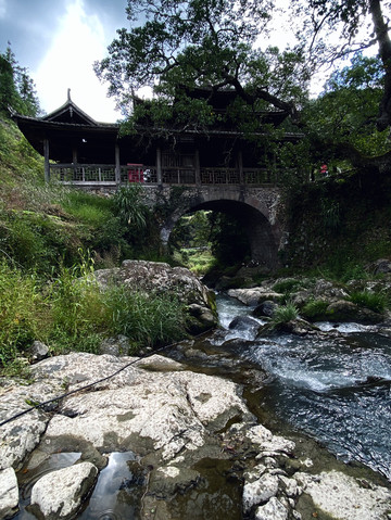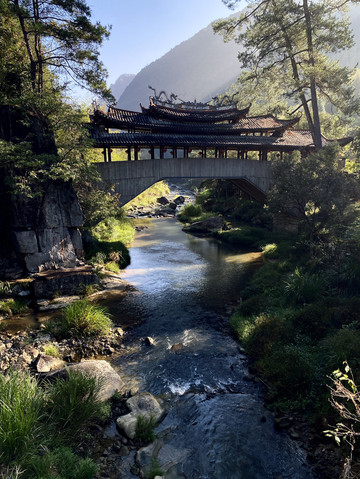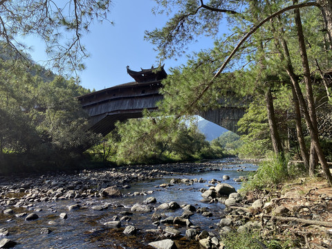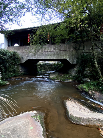 入住休整一会,便步行探访廊桥。首先来到白云桥,桥不大,却倚山势而建,一头以巨石为基,一头高垒石块为踏,高耸在溪流之上,倒是不输气势。桥建于清光绪二十八年(1902),为八字撑木纵梁廊桥,长8.34米、宽3.72米中心间重檐歇山顶,檐下设花格窗,内施斗八藻井。