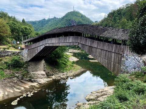 另一座后坑桥在枫堂村,始建于康熙十年(1671年),光绪十一年(1885年)重修,系单孔木拱廊桥,廊屋顶部略带弧形,在蓝天白云下优雅伫立。