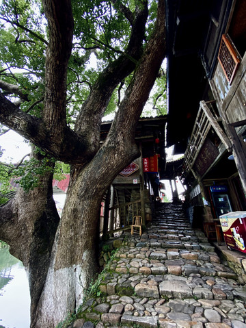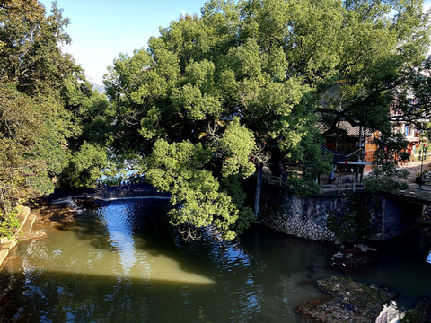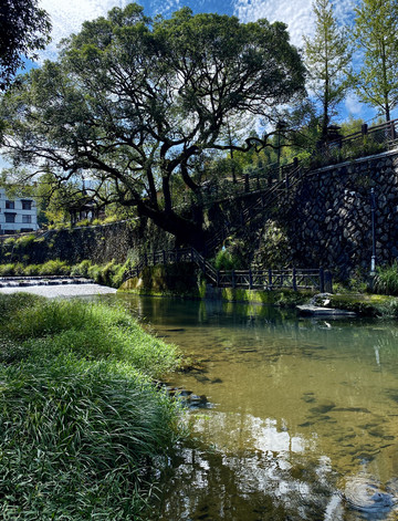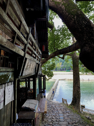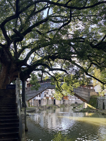早餐起来,独自去溪边领略了北涧桥安静的模样,桥边一颗千年乌桕和一颗1200岁的古 樟树 依然繁茂,碇步上已有美女在摆造型拍照,一位当地居民也牵着2条爱犬信步走过,安静而和谐。