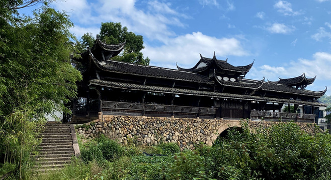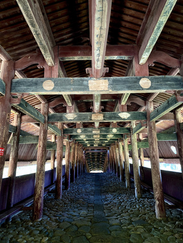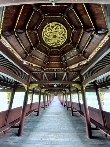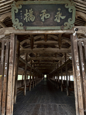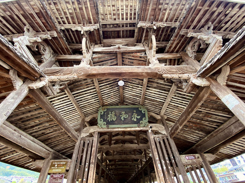 离开松阳,沿着蜿蜒曲折的山路来到玉岩镇,普济桥就坐落在村口。此桥始建于明代正德年间,清雍正年间修缮,系两孔石墩伸臂木梁廊屋桥,桥长26.5米,宽5.5米,孔跨6.5米,明间为明代原物,天花藻井用“卍”字斗拱承托,极具特色。