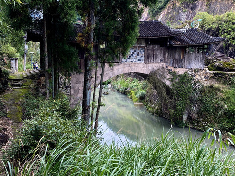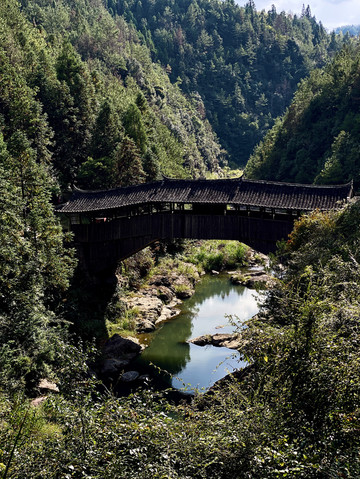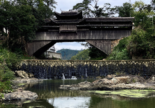 告别月山村,沿着山路往寿宁方向行进。经过一段艰难的修路坑洼路段,在龙溪乡鱼川村寂静的山谷中,看到了静卧着的垅桥,横跨兀立于溪流两侧的巉岩上,四周山峦黛影倒映于水面,加深了水色,静静的水面呈现出铜锈般的幽绿。此桥始建于清乾隆四年(1739年),全长22米,净跨11.8米,地势十分险峻。