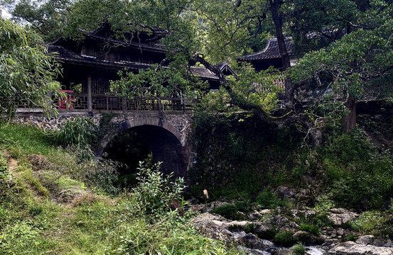 如龙桥应该是月山最美的桥,桥横卧于举溪之上,因其势与后山山脊依稀相连,桥似龙首下倾,故得名“如龙桥”。始建于明初,现桥修建于明天启五年(1625年),全长约28米,宽5米,设廊屋九间集亭台楼阁于一体。此桥一改常见的对称形式,在东端建三重檐歇山顶钟楼,如龙首高昂,精美异常。桥中佛龛上额悬挂一木匾,上书“如龙桥”三个遒劲大字,相传为当年名士吴懋修的儿子、8岁神童吴之球所书。据说如龙桥雄伟壮观,全桥竟未用一枚钉子。