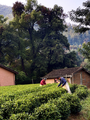 清晨,又去村里转了转,几乎没有人,路上有几条田园犬在玩耍,村口的小茶园,一对老夫妇在采茶。