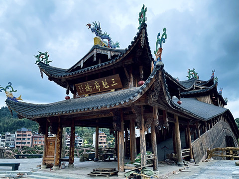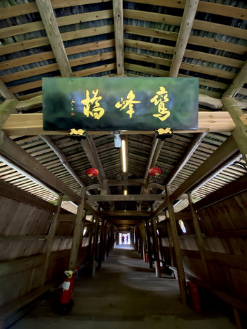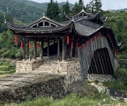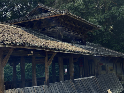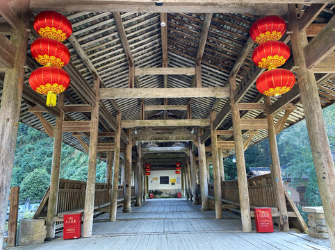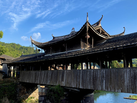另外一座就是同庆桥,建于2004年,同样由董直机老人亲自完成,全部采用传统木榫卯结构,桥横跨岭北溪,廊屋分三层,有20个挑角,廊壁雕龙刻凤。