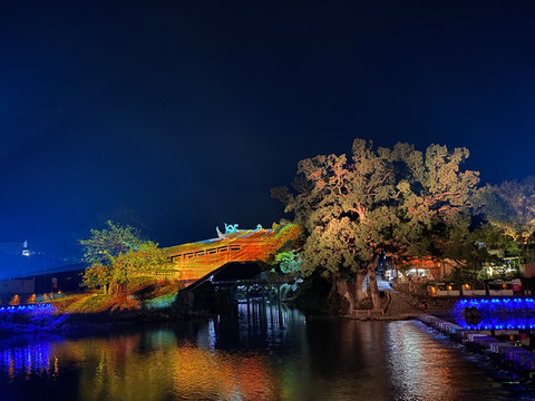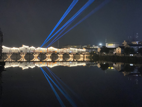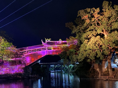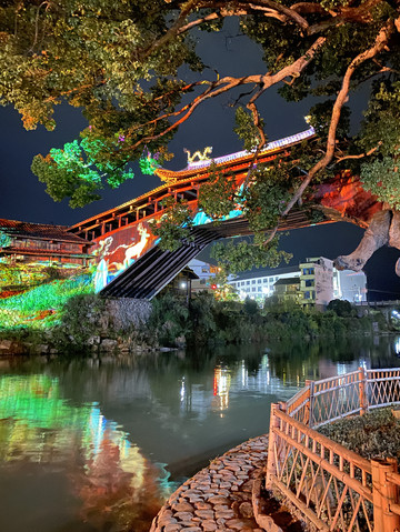 经过碇步桥至对岸用过晚餐后,正好是北涧桥晚上灯光秀时间,美轮美奂,但感觉有点过于艳丽,与景观有点不搭。