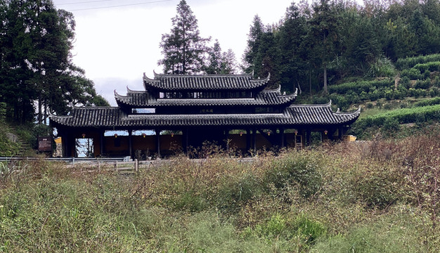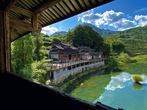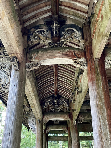 桥边便是著名的西洋殿,始建于宋咸淳元年(1265),又名“松源殿”或“吴判府殿”,是庆元、龙泉、景宁菇民为纪念“香菇鼻祖”吴三公而建总进深32米,面阔19.4米,占地952.35平方米,久经千年风雨而不颓,照壁、门厅、戏台、中亭和正殿层层叠进,八字形照壁飞檐画栋,重檐歇山钟鼓楼雕梁翘角,正殿的梁、枋、牛腿、撑拱、雀替、斗栱等构件从微小见恢弘全貌,浓郁古朴的玄、赤、青、白四色掩映在青山绿水之中,成就摄人心魂的美。