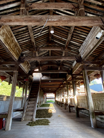 趁着天色未暗,边在村里闲逛。村中有一座胡桥,胡桥的外貌和概念里的廊桥相去甚远,方方正正,如果不是跨溪而建,几乎可以当它是一座房屋。它是浙西南山区特有的抬桥式木结构的古桥,长17.4米、宽17.2米、跨径10米,始建明朝,有的建筑是在清朝康熙二十三年和现在重修的。 胡桥是见的正方形木桥,外形很独特,里面更是戏台、店铺林立,旧时,大漈人就在这里以货兑货,鸡蛋换盐,既便利交通的作用,又兼具贸易、人际交往、文化娱乐等多种用途。