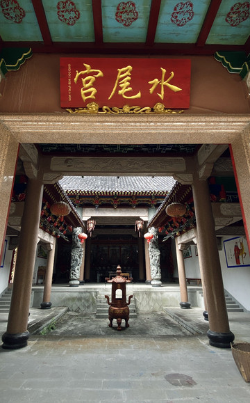 伴在桥边的还有一座正在建造中的水尾宫,雕梁画栋、工艺繁复。