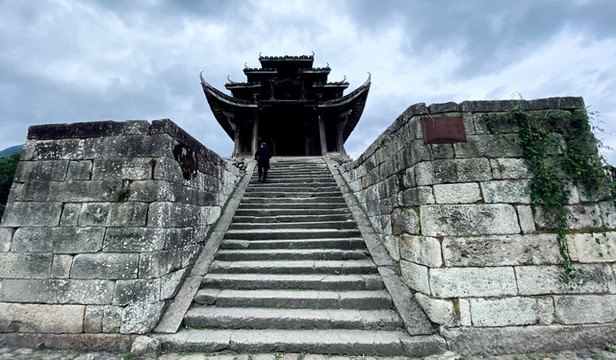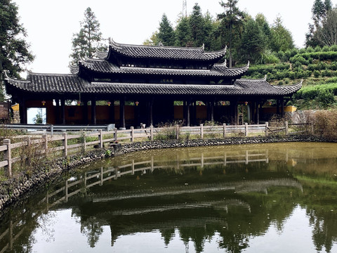 路的尽头是清风桥,始建于乾隆年间(1736—1795),三层三檐结构,桥前设一弧形池塘。