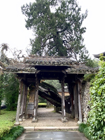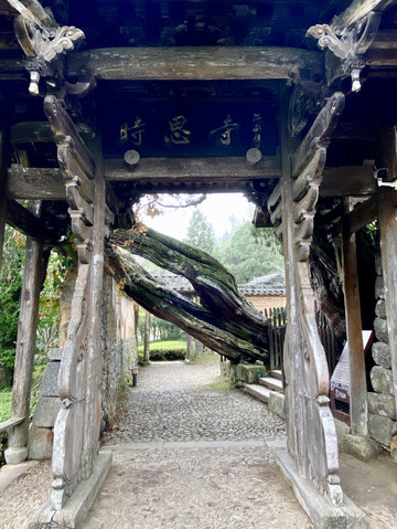 时思寺的山门很小,黑底描金“时思寺”的古老木构门牌后,门后一卧一侧两棵虬曲的千年巨柏让古意扑面而来。